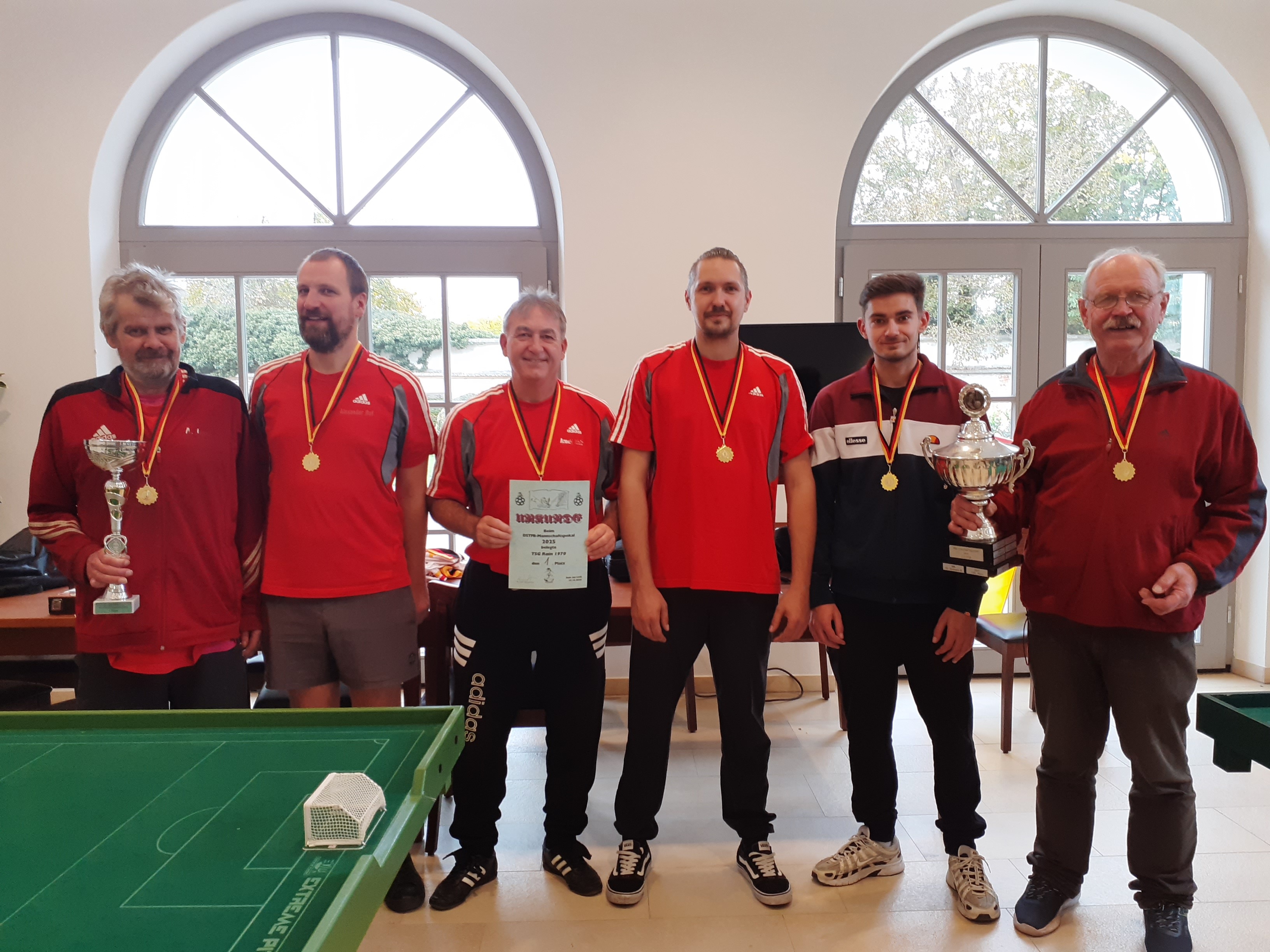 Die Kulinarik-Sektion des DSTFB stellt sich trotz Bildungsreise nach Malta weiterhin die Frage: In jedem ungeraden Jahr gibt es den Vorzeigewettbewerb der ECSTFA zu bestaunen: die Europameisterschaft. Diesmal durfte Malta sein organisatorisches Talent für Großveranstaltungen beweisen. Einige unserer Athleten waren neugierig und was diese dort erlebten, wie sie es fanden und noch so einiges mehr... TSG Rain gewinnt Deutschen Pokal in RainDSTFB-Pokal 2025Rain am Lech, 18./19.Oktober 2025v.l.n.r. Andy Jung, Alex Ruf, Arnold Mair, Andreas Jung, Moritz Jung und Hans Ruf Zu einem Turnier in Rain gehören Leberkäs, Kartoffelsalat, Weizen und auch Helles, was einem paradoxerweie gern mal die Lichter ausknipst... Weitere Details vom 57. DSTFB-Pokal, ganz sicher nicht nur für die interessierten Leser der Donauwörther Zeitung, findet man hier Schnippend zum neuen HobbyMein erstes Subbuto-TurnierRain am Lech, 18./19.Oktober 2025Anke Gersie und ihre erste Siegerehrung bei einem DSTFB-Wettbewerb Erstmals bei einem Subbuteo-Turnier dabei. Viele haben Respekt vor diesem Schritt. Anke Gersie hat ihn gewagt. Und wie es einem dabei ergehen kann, hat sie festgehalten in ihrem Erfahrungsbericht Weitere Meldungen aus 2024/25TSG Rain 1970 holt sich souverän den TitelDeutsche Mannschaftsmeisterschaft 2024/25Kamen-Methler, 15. Juni 2025