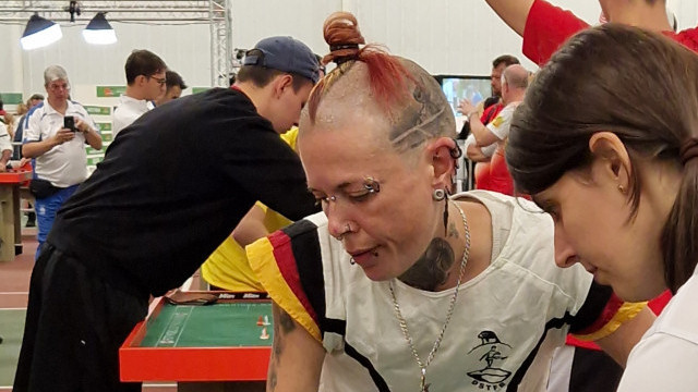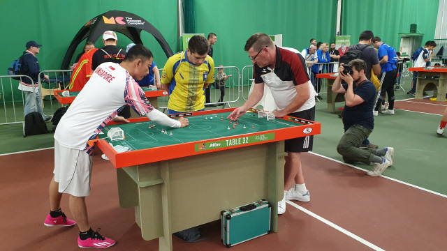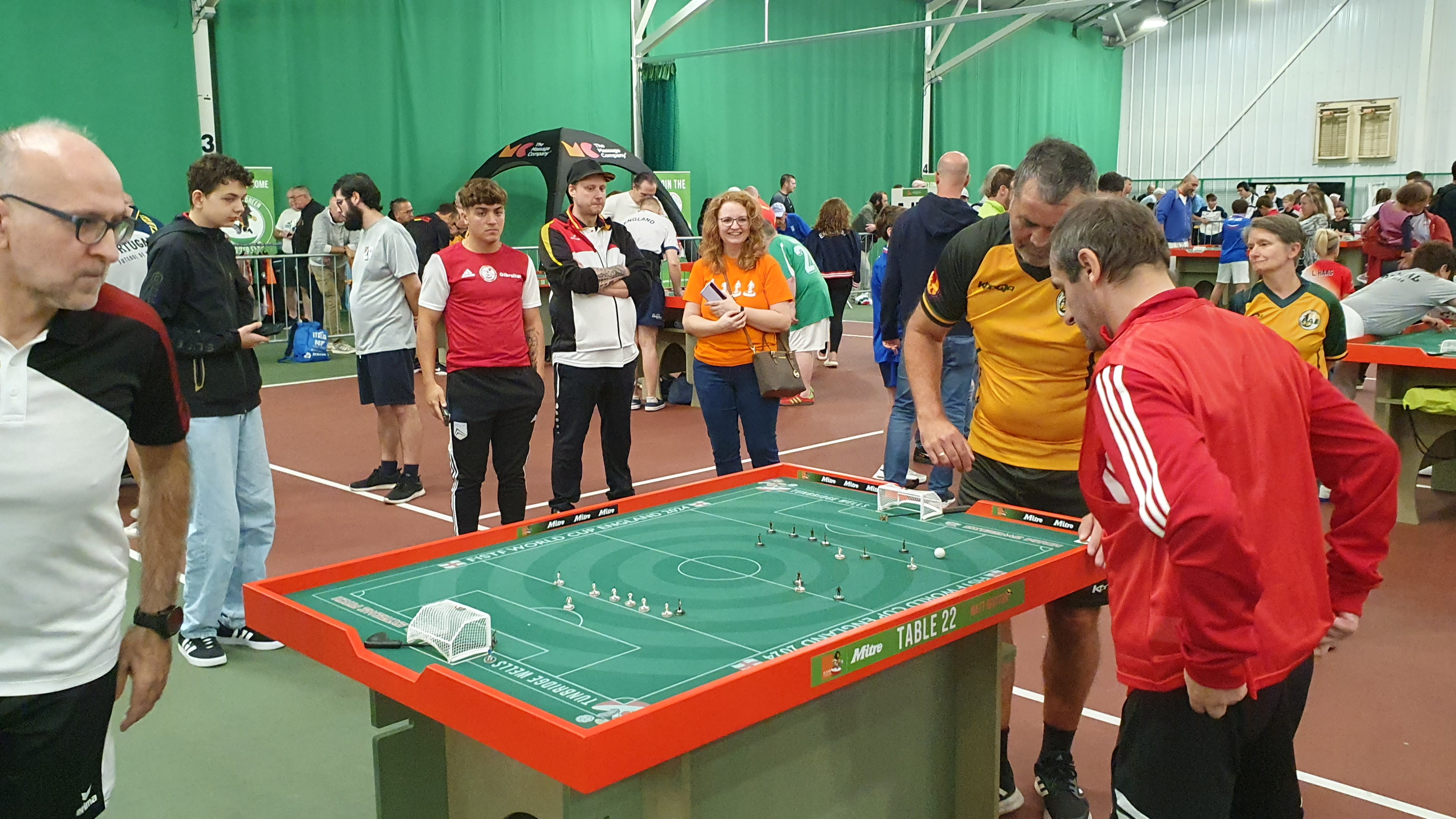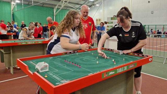 Die beiden deutschen Einzelstarter bei den Veteranen hießen Frank Stiller und Panagiotis Krommydas und wurden in die Gruppen 16 und 11 gelost. Da Daniela Grünberg leider kurzfristig ausfiel, gingen in der Damenkategorie nur zwei Spielerinnen für den DSTFB an den Start. Weil ihre Vorrundenspiele (man beachte:) früher als geplant angepffiffen wurden, gab es zunächst ein wenig Hektik, denn beide waren beim Anstoß noch garnicht in der Halle. So ging es direkt nach Ankunft mit leicht erhöhtem Puls ins Turnier. Dabei erzielte Victoria Büsing in Ihrer Gruppe sehr torreiche Ergebnisse. Sowohl die belgische Spielerin Chloé Despretz als auch die Italienerin Giulia Pibiri hatten gegen Victoria Büsing keine Chance. Einzig die erfahrene Französin Françoise Guyot konnte sich mit einem haarscharfen 3:2 gegen Victoria durchsetzten. Daria Tilgner erwischte eine undankbare Dreiergruppe. Mit Audrey Herbaut (FRA) und Elodie Bertholet (BEL) waren es zwar sehr faire Spiele, doch wenn das Runde immer nur ins eigene Eckige geht, kommt man nicht weiter. In der U20 spielte Marian Flemer in der dritten Gruppe, und in der U16 wurde Deutschland von Noah Wulff vertreten. Marian Flemer hatte ein Brett zu bohren. Er hatte neben den Halbfinalisten Jann Segers (BEL) auch noch den Viertelfinalisten Francesco Borgo (ITA) in seiner Gruppe. Er schonte seinen Schnippfinger, um am nächsten Tag im Openteam alles zu geben. Noah schlug sich sehr gut in seiner Gruppe 8. Ein Sieg gegen Diago Mori (JPN) 2:1, eine knappe Niederlage gegen Maxim Grosdent (BEL) 2:3, doch Angelo Bisio (ITA) war in Torlaune und schlug Noah mit einem 5:1.