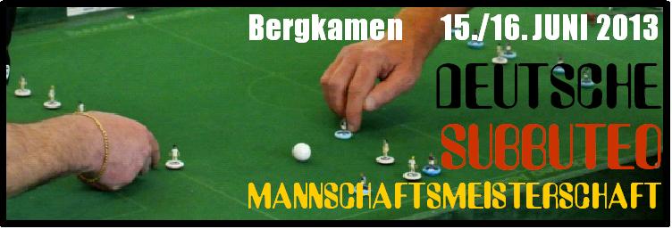 DEUTSCHE MANNSCHAFTSMEISTERSCHAFT 2012/13Bergkamen, 15./16. Juni 2013Diese Endrunde war einfach Spitze!Wer dabei war, wird es genossen haben - wer gefehlt hat, darf sich ärgern. Selten war eine DMM so spannend und gut besetzt gewesen. Von den ersten Sechs in der Tabelle konnte jeder jeden schlagen - und man tat es auch. Doch bei allem sportlichen Ehrgeiz blieb die Fairness niemals auf der Strecke. Auch das Drumherum stimmte: am Samstag wurde gemeinsam lange und intensiv gegrillt, gesungen, geschwatzt, gesubbelt und bis tief in die Nacht gefeiert. Mit Sparta Spreeathen 74/82 hat der DSTFB im Jahre 2013 einen verdienten Deutschen Mannschaftsmeister hervorgebracht, dessen Konkurrenten ihn allerdings auch mächtig gefordert haben. (Fast) alle Teilnehmer der diesjährigen DMM auf einen Blick. (Foto Wojtas) Janus Gersie: "Atmosphäre, Organisation und das ganze Drumherum waren hervorragend. An diesem Wochenende konnte man sich im Kreise guter Freunde einfach wohlfühlen." Zur großen Freude aller Anwesenden ließ der DSTFB-Ehrenvorsitzende Günter Czarkowski es sich nicht nehmen dem Startschuss der 2013er Ausgabe der DMM im DSTFB beizuwohnen. Die TSL Dortmund hatte die Ausrichtung übernommen (mit Unterstützung von Borussia Bergkamen) und das Jugendheim Yellowstone in Bergkamen-Oberaden wurde als Spielstätte hergerichtet. Die warme und kalte Verpflegung vor Ort war ausgezeichnet und ein neues DSTFB-Eventspiel ("Knack den Jackpot") gibt es ab jetzt auch: Eine Bonboniere rangvoll mit Kronenkorken stand im Raum und es konnte getippt werden, wie viele Kronenkorken es denn wohl sind. Der Tipp-Einsatz betrug 1 € und wenn einer die genaue Anzahl getippt hat, bekommt er den Jackpot. Andernfalls heißt der Gewinner DSTFB. Die besten deutschen Vereine waren in diesem Jahr am Start und drei von ihnen schickten sogar ihre 2. Mannschaften