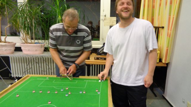 Freuen durfte sich auch Fabio Bianco, der sich mit dem vierten Platz nach Björn, Marcus und Marcel erneut die Teilnahme an der Deutschen Meisterschaft in der Open-Kategorie sicherte. Mit der hatte auch Tom Horn insgeheim geliebäugelt, aber letztlich war er mit dem 5.Platz überaus zufrieden, zumal er bereits die Quali für die Veteranen-DM in der Tasche hatte. Alwin Krause landete diesmal im Mittelfeld der Tabelle, dennoch dürfte sein weiterer Aufstieg auch durch die Pubertät nicht aufzuhalten sein. Matti Odelga wirkte insgesamt etwas Subbuteo-müde, bei ihm ist normalerweise viel mehr drin. Thomas Pröhle und Klaus Fritz hatten sich vielleicht auch mehr ausgerechnet, aber können sich damit trösten, für die Veteranen-DM qualifiziert zu sein. Felix Eger ist doch etwas die lange Pause wegen seines Auslandsjahres anzumerken, aber er wird sich wohl wieder ranarbeiten. Schließlich noch die beiden Damen im Feld: Maike muss man inzwischen nicht mehr mit Samthandschuhen anfassen, sie verinnerlicht das Spiel immer mehr.